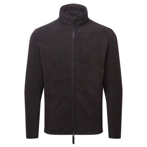 Men’s long sleeve fleece jacket with contrast trim detail. High neck rounded collar, leading into a two-way zipper. Two zipped external pockets and two internal open pockets. Stitched side panel detail. Elasticated cuff with trim detail. Contrast fabric hook on back of collar for hanging up.