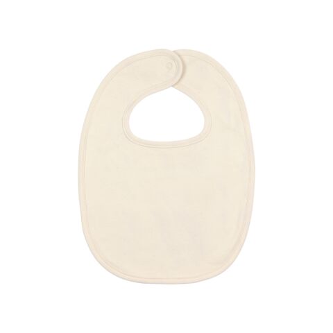 Baby bib with double-layer interlock. Self-fabric rouleau binding at neck and outside edge.
