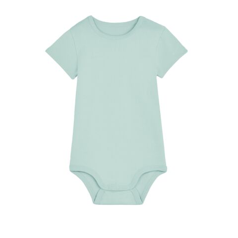 Short sleeve baby bodysuit. Set-in sleeve. 1x1 rib binding at neck collar and leg opening. Snap placket at shoulder. Snap closure at bottom.