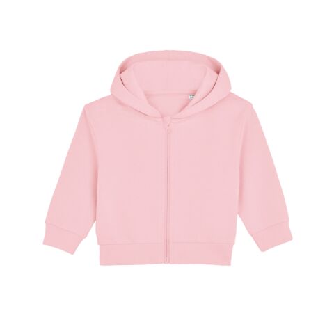 Baby zip-through sweatshirt. Set-in sleeve. Lined hood in single Jersey. Single Jersey tape at inside back neck and at inside of zip. Nylon coil-reversed zip at centre front. Two-sided zip guard at top of zip. Self-fabric half-moon at back neck. 1x1 rib at sleeve hem and bottom hem.