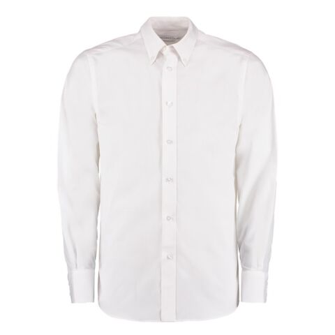 Fused stand-up button-down collar. Single needle stitched yoke and armholes. Double-stitched sleeve and side seams. Two-button cuff with no button pointed cuff placket. Back yoke. Rounded hem. Spare buttons. Kustom Kit® woven back neck label.