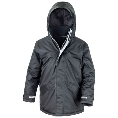 Waterproof-StormDri 2000. Windproof. Fully taped waterproof seams. Long fit. Super warm. Concealed 3-panel hood in collar. Full front heavy duty zip. 2 concealed front pockets with storm cover. Super warm fleece-lined collar. Reflective cuff. Fleece-lined front pockets. Adjustable drawcord hem. Ready to brand cut cut-away label. Decorating methods: Embroidery, Direct print, Transfer print. Decorators access point: Full hem and left chest.