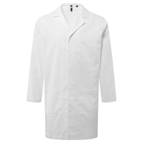 Classic three-pocket workcoat. Unisex styling. Two large lower patch pockets. Left chest patch pocket with pen holder. Lapel collar. Five concealed press stud buttons for fastening. Bar tacking for extra reinforcement. Loop on the inner neck for hanging up. Designed to withstand industrial washing for cleanliness and hygiene. Contains certified recycled polyester.