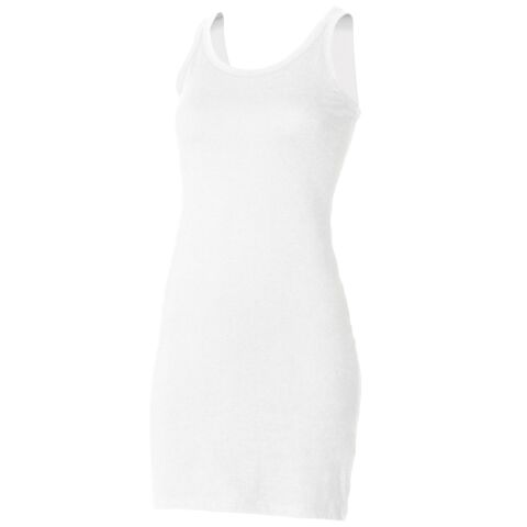 Broader shoulder, modern-look tank very-long length vest in stretch cotton rich fabric for comfort and shape retention. Binding around neck and armholes. Can be worn either as long length tank or a short dress.