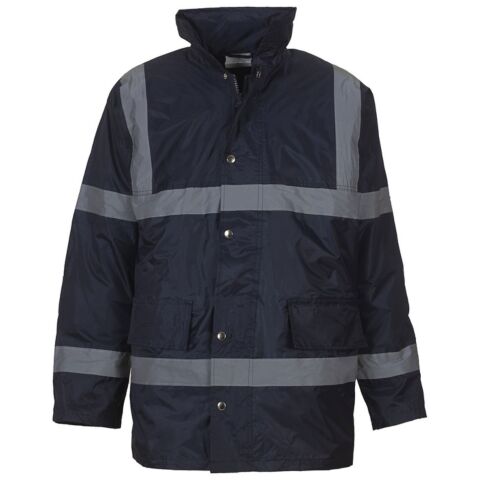 Fully waterproof & windproof security jacket with the enhanced visibility for safety. PU coated Nylon outer fabric with 190g quilted padding and Nylon lining. Heavy duty zip with studded storm flap. 2 outer pockets with over flaps. Elasticated Knitted storm cuffs in the sleeve ends. Step collar with a concealed integral hood. Inside breast pocket. Throughout stitched and taped seams to ensure waterproof. Matching trousers available, code HVS461.
