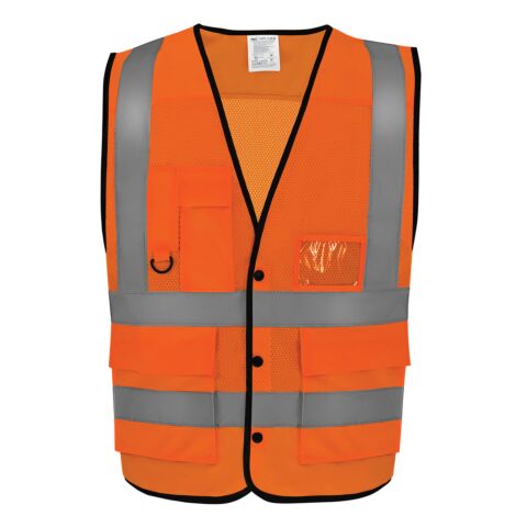 Conforms to EN ISO 20471:2013+A1:2016 Class 2 and EN ISO 13688:2013+A1:2021. Hi-vis Orange also conforms to RIS-3279-TOM. Proudly made of 100% recycled polyester. Super-cool open mesh around the body for comfort. Front button closure ensures quick release for enhanced safety. ID chest pocket with reinforced piping. Pen and mobile phone pockets, plus keyring. Two bottom pockets with top and side two-way access. Great size choices. Large decoration area for logos.