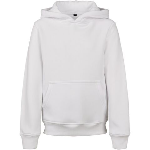 Ribbed cuffs at hem and sleeves, flat kangaroo pocket, outer fabric hood without drawstring and half-moon neck.