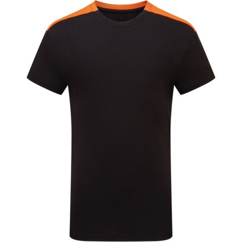 Wicking fabric. Stretch. Crew neck. Short sleeve. Lightweight. Cationic-dyed. Twin-needle stitching on hem and arms. Contrast shoulder and side panels. 100% certified recycled polyester. UPF 40+.