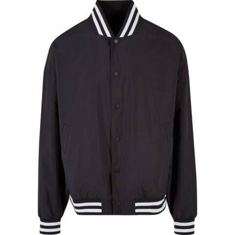 This traditionally styled men’s college jacket is a sporty classic with a striped stand-up collar and elastic cuffs on the sleeves and hem. It has a casual, loose fit with dropped shoulders, fastening via a snap button placket. The light college jacket is made from robust polyester fabric and can further be refined with screen or flex printing.
