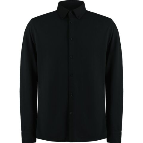 Matching fused, stand-up, button-down collar. Matching fused, two-button adjustable cuff with pointed cuff placket. Interlined seven-button placket. Double-stitched armholes and side seams. Twin-needle straight back yoke. Spare buttons in care label. Kustom Kit woven back neck label.