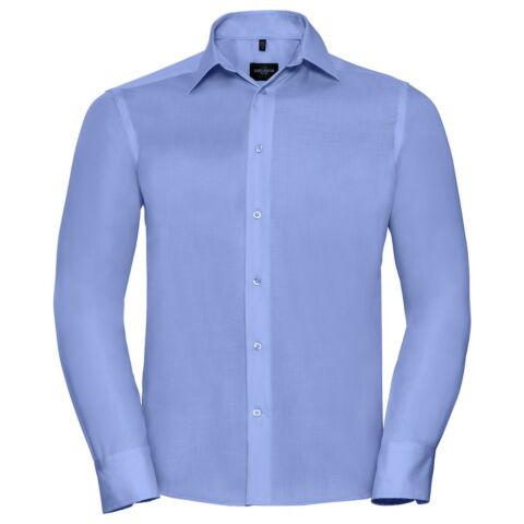 Made from a new type of non-iron fabric that stays wrinkle free and keeps the wearer looking smart all day long. Contemporary tailored cut with modern stiffened, semi- cut away boned collar. Mitred cuff, adjustable with two buttons and with option for cuff links. Without chest pocket. Rounded hem.