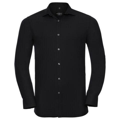 A unique and subtle comfort stretch from this advanced Elastomultiester Lycra® T400® fibre fabric creating a premium shirt that stays looking crisp and sharp all day long. Excellent shape retention for a lasting fit. Moisture management for cool comfort. Durable fabric. Fitted fit. Short leaf, semi cutaway collar. Narrow placket. Darts at back. Square edged cuffs. Cuff link options.