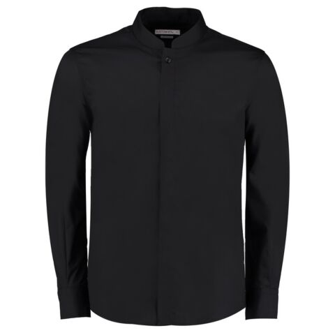 Soft interlined fused mandarin collar. Concealed front placket. Rounded hem. Single-stitched front and back yoke and armholes. Double-stitched side and sleeve seams. Two pleats at the back. 1-button adjustable cuff with button cuff placket. Spare buttons. Kustom Kit® woven back neck label.