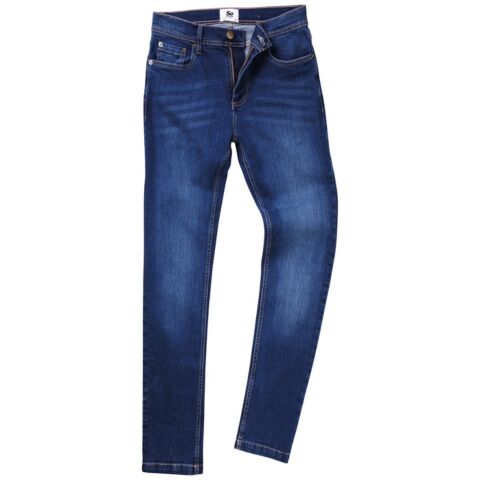 Slim fit. Stretch denim. 5 pocket styling. Light blasting & whiskering (blue washes only). Self-fabric belt loops. Shank button and YKK zip fly fastening. Metal rivet detail at pocket corners. Twin needle stitching detail.