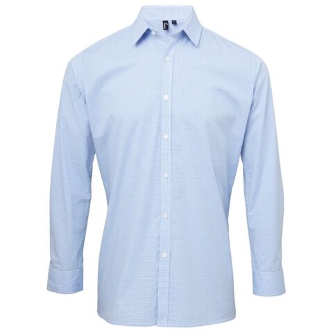 Long sleeve fitted shirt with soft collar styling. Double buttoned cuffs. Gingham pattern. Back yoke.