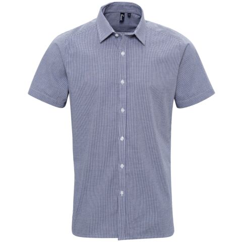 A short sleeve shirt with soft collar styling. Two colour Microcheck gingham style pattern. Semi-fitted styling.