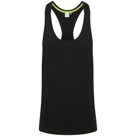 Shaped work out vest, lightweight soft hand feel fabric, self fabric binding, tear-out label.