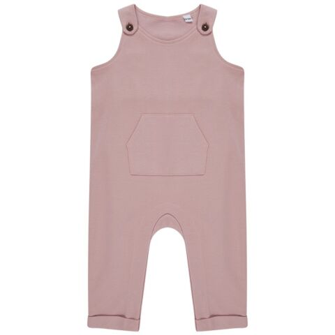 Cotton dungarees made in sustainable fabric with horn-button shoulder fastening. Central kangaroo pocket. Rolled and stitched leg hems with integral poppers around the inseam. Single Jersey facing. Tag-free.