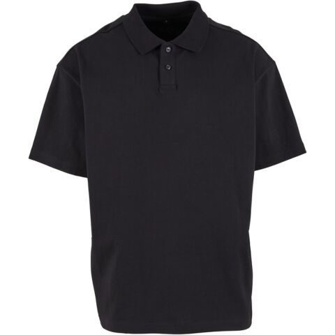 Oversized fit. Dropped shoulders. Polo collar with two-button closure.