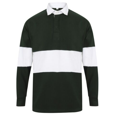 Tag free retro fit rugby shirt. Cut and sew contrast stripe panel around centre. Heavyweight single Jersey. Contrast traditional woven (twill) rugby collar. Herringbone back neck tape. Contrast herringbone taped side vents. Taped shoulders. Elastane reinforced ribbed cuffs for shape retention. Twin-needle hem. Topstitching at armholes and panels. Concealed button placket. Herringbone inner placket. 2 x rubber buttons.