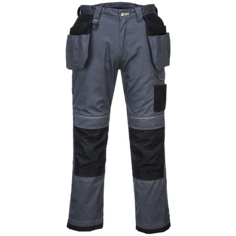 Contrast colour stitching. Contrast panels. Double rule pocket. Hammer loop. Reflective piping. Side pockets. Triple-stitched seams. Two back patch pockets. UPF 50+. Side elastic waist. Holster pockets. Gripper elastic on inner waist. Top-loading knee pad pockets. Smart phone pocket. D-ring. 12-pockets. Cargo pocket on side leg. Adjustable leg length. Reinforced panels . Durable polycotton fabric.