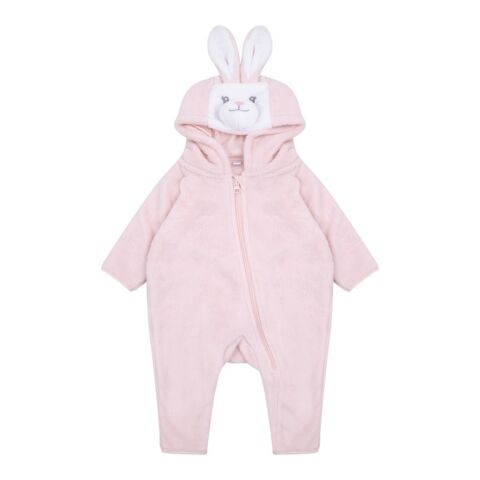 Hooded all-in-one in super-soft plush fabric with rabbit ears, eyes, and nose detailed on the hood. YKK zip down the centre front and down the leg. Tail detail on the back. Binding on sleeve and leg hems.