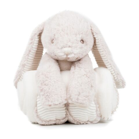 Light Brown soft plush rabbit. Contrast cream corduroy under ears and on paws. Hook and loop fastening on paws. Separate cream blanket in microfleece with contrast blanket stitching on edge. Delivered in a presentation bag with cream ribbon. Remove all hang tags and their fasteners before giving these items to a child. Suitable for children of all ages. Complies with EN71 European Toy Safety Regulations.