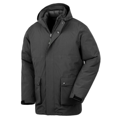 Outer: dual-opening front patch pockets with zipped sides. Waterproof, zip-through, soft-feel, tricot-lined collar. Detachable, adjustable hood with peak. Open cuff with soft tear-release. Stud-closing double storm flap. Underarm eyelets. Fully-taped seams. Wrinkle/crease-resistant fabric. Inner: recycled zip-through collar. Elasticised hem and cuffs. Zipped pockets. Hang loop. Made with 100% recycled polyester and nylon.