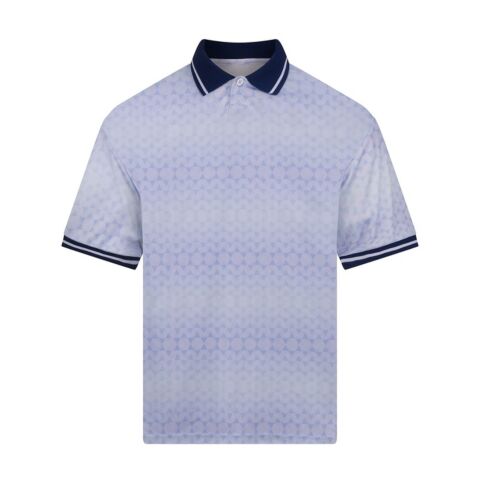 Relaxed fit. Contrast knitted collar. Tear-away label. Wicking fabric. White/Navy and Red/White options have retro-patterned printed fabric. Set-in sleeve.