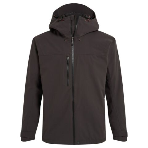 EN343-3.3 AquaDry membrane recycled polyester stretch ripstop with H2OShield DWR, polyester elastane stretch mesh and recycled polyester taffeta lining. Recycled zip tape to all zips except centre front and chest pocket zips. GRS certified fabrics, ETI factories, REACH compliant.