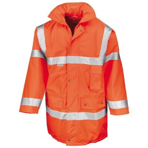 EN ISO 20471:2013 + A1:2016 Class 3. EN 343:2019 3:1. RIS-3279-TOM ISSUE 2:2019 Class 3 (orange). Waterproof 3000mm. Windproof. 50mm sewn on reflective body bands incorporating 3M™ Scotchlite™ Reflective materials – strategic positioning for full shoulder and LBP decoration. Generous size allows for over garment wear. Heavy duty zip with stud closing storm flap. Concealed adjustable hood in collar. Seamless watershed shoulders. Underarm ventilation eyelets. 3 external pockets. Fully taped seams. Inside pocket. Hang loop. Note: These garments should be worn fastened and kept clean to maintain effectiveness. Conforms to 89/686/EEC directive. Decorating methods: Embroidery, transfer print, direct print. Decorator access point: Inner back hem zip.