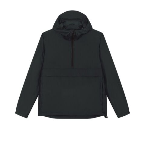 Longer back length with curved hem for protection. Bottom hem and hood with adjustable plastic stopper and elastic cord. Sealed hood visor. Zipped welt pockets. Non-functional flap, front and back. Self-fabric half-moon at back neck. Inside zip opening at bottom hem and inside loop, with snap at armhole providing easy access for chest decoration.