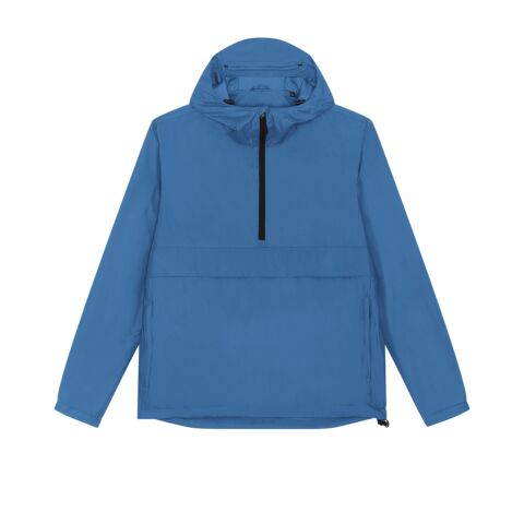 Longer back length with curved hem for protection. Bottom hem and hood with adjustable plastic stopper and elastic cord. Sealed hood visor. Zipped welt pockets. Non-functional flap, front and back. Self-fabric half-moon at back neck. Inside zip opening at bottom hem and inside loop, with snap at armhole providing easy access for chest decoration.