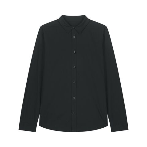 The Stella Styler poplin shirt for women. Relaxed fit. Point collar with single-needle topstitches. Collar stand. Grown-on-placket with single-needle topstitches on each side. Forwarded shoulder. Back yoke with box pleat. Inside yoke in self-fabric. Dropped shoulders. Sleeve placket with one button. Sleeve cuff with two buttons. Rounded cuff corners. Double pleats at cuff seam.