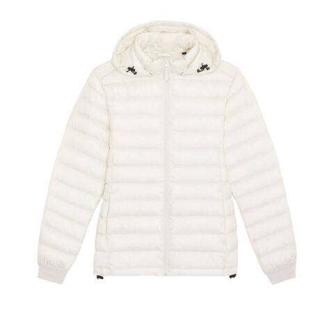 High collar with detachable hood, including metal matte hidden snaps. Hood opening and bottom hem with adjustable plastic stopper and elastic cord. Zipped welt pockets with extra grosgrain pull. Fully quilted. 1x1 rib at sleeve hem.