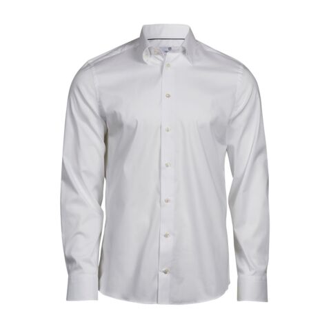 Shaped fit. Fused collar and cuffs. Darts on back. Curved hem. Easycare. Ascolite button wrapping.