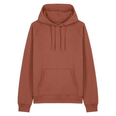 Raglan sleeves. Double-layered hood in self-fabric. Kangaroo pocket at front. 1x1 ribs at sleeve cuffs and bottom hem. 1x1 rib side panels. 1x1 rib bindings at pocket openings. Double-needle topstitches at the collar, sleeve cuffs and bottom hem. Three-needle flatlock stitches at raglan seam and side panel seams. Inside herringbone back neck tape. Self-fabric half moon at the back neck.