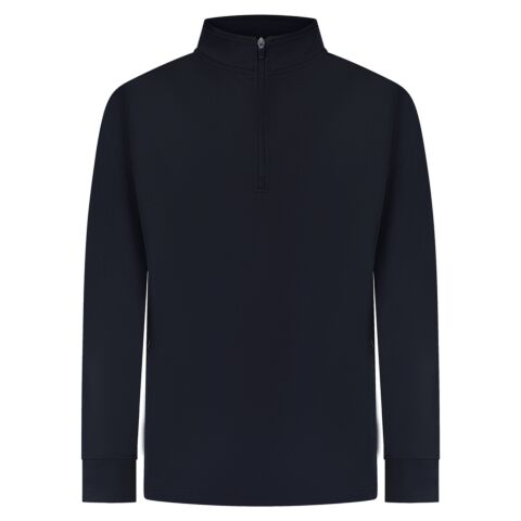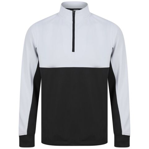 Contrast upper chest and underarm panels. Quarter zip. Side panels. Reverse nylon zips centre front and side pockets. 1x1 ribbed cuff sleeve. Semi-automatic zip pull and slider.