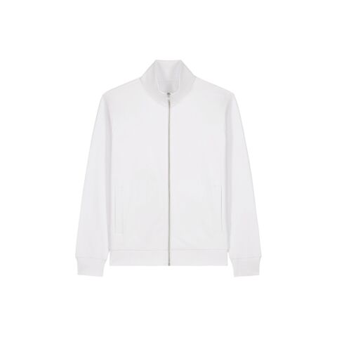 Unisex high-neck zip-through sweatshirt. Set-in sleeves. Self-fabric high-neck collar. Inside herringbone back neck tape. Self-fabric half-moon at the back neck. Metal zip at centre front. Welt pockets. 1x1 rib at sleeve cuffs and hem. Contains certified organic cotton and recycled polyester.