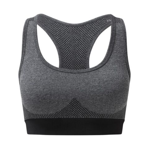 Seamless sports bra. Contrast grown on waistband. Wicking fabric. Body sculpting design detailing. Medium impact. We recommend using block out vinyl and inks.Product contains no branded neck or waist label. Removable Kimble or looped garment tags. Inner seam label holds important product information on one label with a second label containing brand information which can be cut-away.