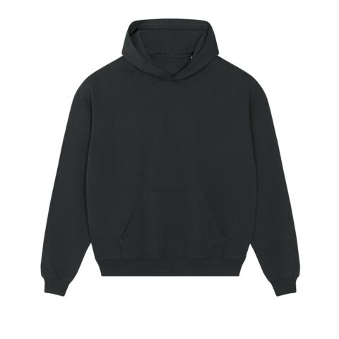 Unisex boxy dry hand-feel hoodie sweatshirt. Set-in sleeve. Double-layered hood in self-fabric. Inside single Jersey back neck tape. Self-fabric half-moon at back neck. Single needle topstitch at neckline and along hood opening. 2x1 rib at sleeve hem and bottom hem. Armhole, sleeve hem and bottom hem with twin-needle topstitch. Kangaroo pocket at front.