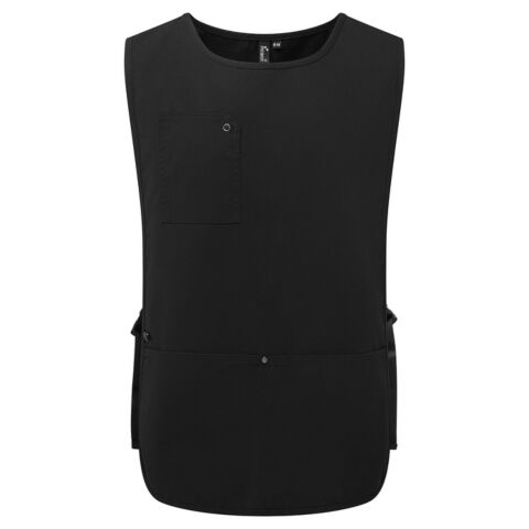 Over-the-head vest apron. Heavyweight, durable canvas fabric. Side fastening with seatbelt-style straps and clip fastening buckle. Left chest pocket with press stud fastening. Two, large tablet-friendly pockets. Finished with a trimmed edge. Two unisex sizes. Contains certified recycled polyester. Available in sizes S/M (70cm long x 36cm wide) and L/XL (78cm long x 38cm wide).