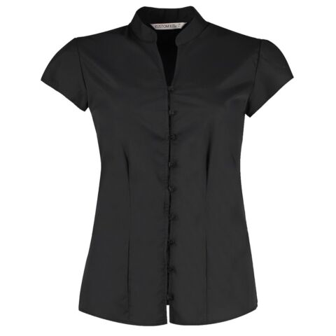 Stand-up mandarin collar. Front inner modesty placket. Self fabric button loops. Two front darts. Two bust darts. Two back darts, Kustom Kit® woven back neck label.