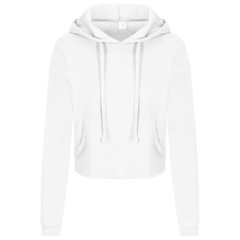 Girlie relaxed fit. Cropped cut with drop shoulder design. Kangaroo pouch pocket. Twin-needle stitching detail. Raw edge hem with cover stitching. Double fabric hood. Flat lace drawcords. Soft cotton faced fabric creates ideal printing surface. Simple tear-out label makes it perfect for rebranding. Brushed inner fleece. WRAP certified. SEDEX certified. Vegan certified.
