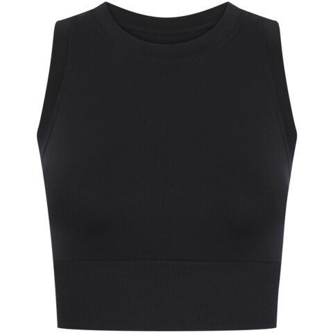 Women’s cropped tank. Seamless fabric. Single-layer front. Self-fabric binding around neck and armhole. Ribbed hem.