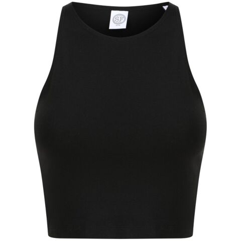 Women's cropped top with racer shape on front and back on neckline. Twin-needle stitching on hem, armholes and neckline. Cropped length. Tear-out label.
