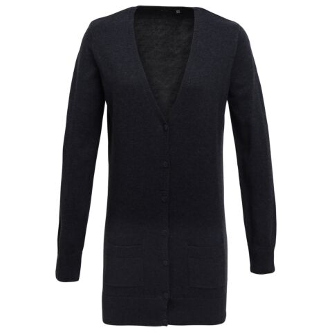 Long length cardigan with cotton rich yarn for a soft feel. Fine gauge knit. Five self-coloured buttons. Two front patch pockets. Ribbed knit v-neck, cuffs and hem.