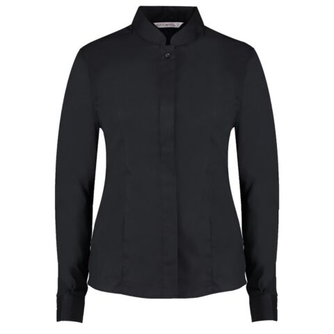 Soft fused mandarin collar. Easy iron. Concealed placket. Rounded hem. Single-stitched front and back yoke and armholes. Double-stitched side and sleeve seams. Two darts to front. Two darts to back. 1-button adjustable cuff with button cuff placket. Spare button. Kustom Kit® woven back neck label.