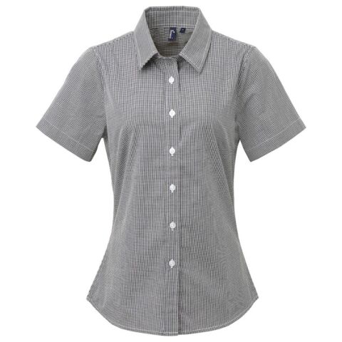 Short sleeve fitted shirt with soft collar styling. Gingham pattern. Curved hem. Bust and back darts. Back yoke.