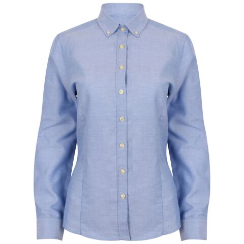 Women's modern fitted, button-down Oxford shirt. Cotton-rich lightweight Oxford with wrinkle resistant finish. Short point collar. Pearlised buttons. Adjustable cuff. Front and back darts for added shape.